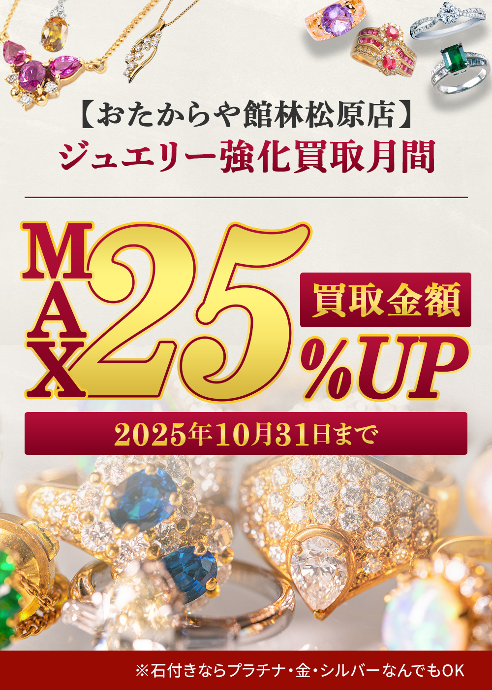 期間中、石(宝石)が付いているジュエリーの査定金額から、最大 25% アップいたします。